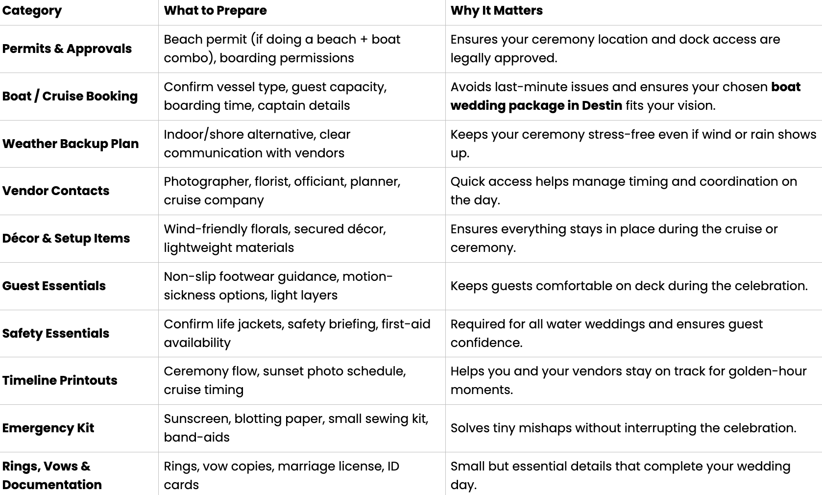 A smooth, stress-free wedding on the water in Destin comes down to smart preparation. While the Gulf breeze, emerald waters, and sunset views do most of the magic, a well-planned checklist ensures nothing interrupts your perfect day. From permits to décor and guest essentials, these simple but important items keep your Destin wedding cruise or boat ceremony organized, safe, and picture-ready. Use this detailed checklist as your go-to guide while planning your waterfront celebration.